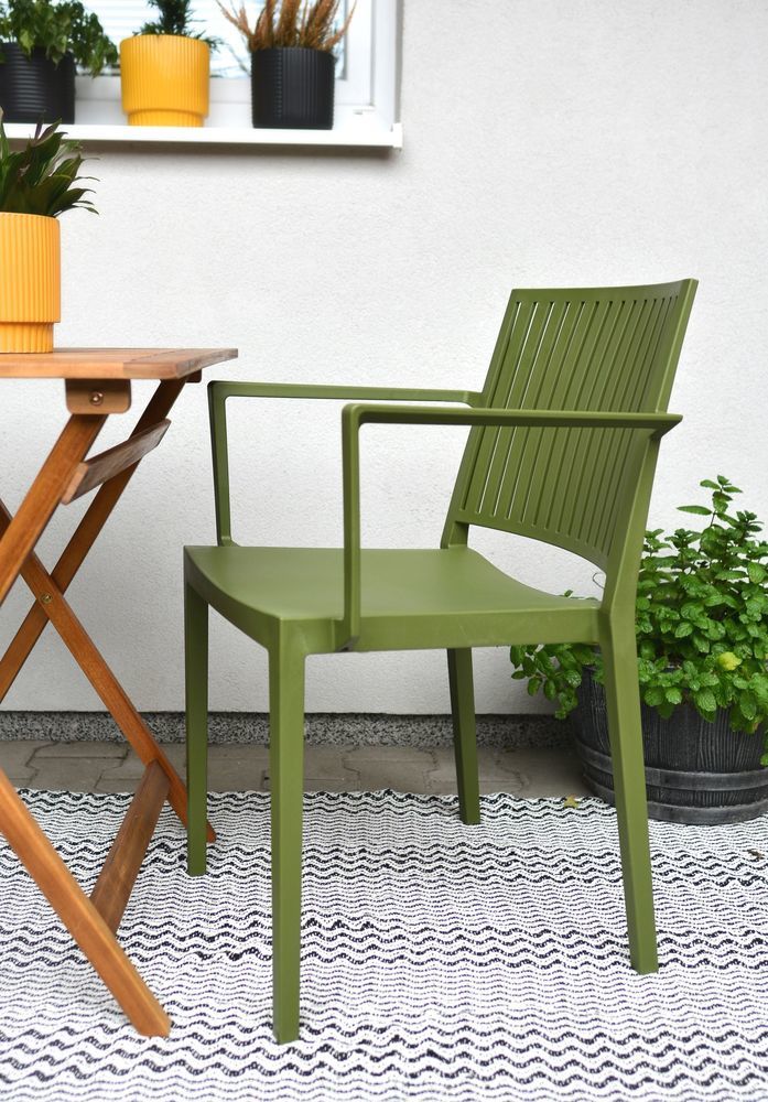 BARS ARMCHAIR fotelj v olivni barvi združuje eleganco z vsestranskostjo. Izdelan iz polipropilena, okrepljenega s steklenimi vlakni, fotelj nudi trajnost in odpornost na UV žarke. Njegova lahka konstrukcija omogoča enostavno premikanje, medtem ko prostorna naslonjala za roke in ergonomski dizajn zagotavljajo udobje in podporo. Idealen je za uporabo v notranjih in zunanjih prostorih.