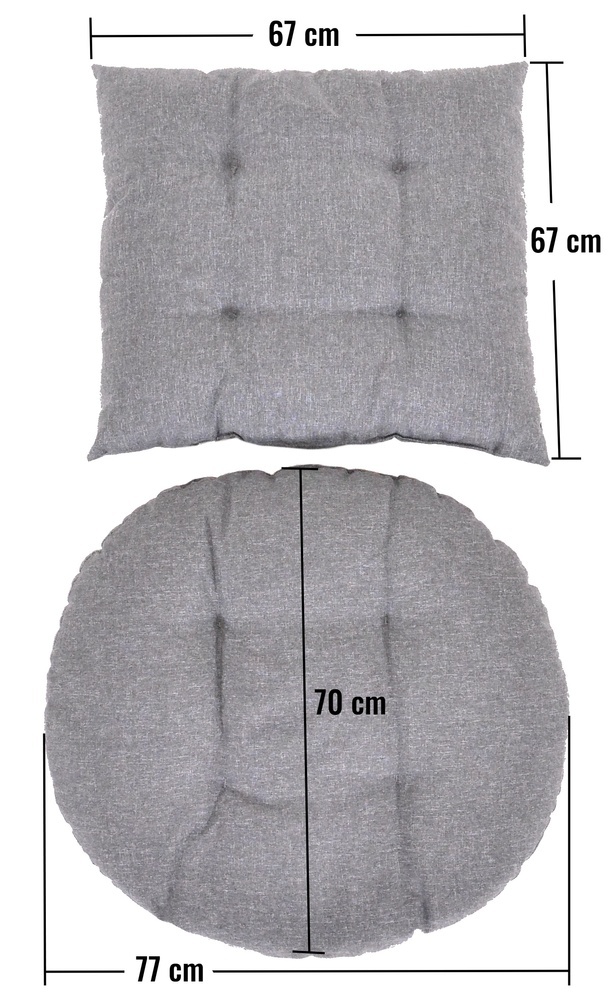 Dimenzije 77 × 77 × 10 cm so natančno prilagojene visečemu stolu CALI in zagotavljajo, da se blazina popolnoma prilega površini. Debelina 10 cm zagotavlja dovolj mehkosti brez izgube podpore, ki jo potrebuje vaše telo.