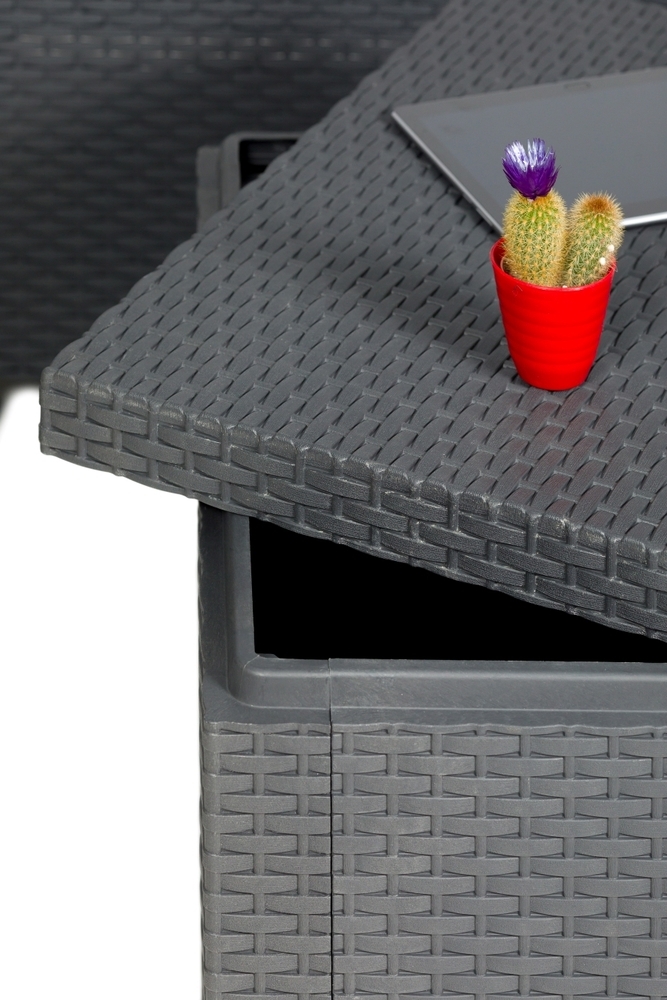 Komplet vključuje 2 fotelja, elegantno dvosedno klop in domiselno zasnovano mizico s funkcijo posode. Vse to je narejeno iz oblikovane plastike, ki združuje izjemen videz ratana in zagotavlja sodobne linije vašemu vrtu.