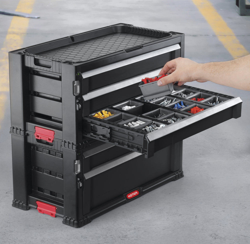 Zgornji predal razdeljen na štiri manjše omogoča shranjevanje majhnih orodij ali pritrdilnih elementov, spodnji večji predal pa je idealen za večje kose opreme.
