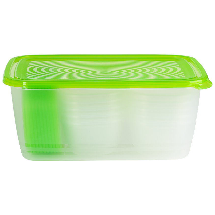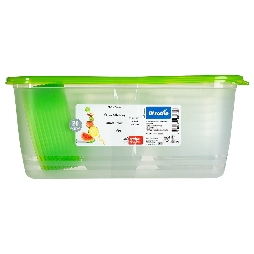 Komplet posod SUNSHINE 11 kosov je popolna izbira za ohranjanje svežine živil. Vključuje eno veliko posodo s kapaciteto 5 litrov in deset manjših po 0,5 litra. Prozorna in zelena kombinacija doda moden videz vaši kuhinji.
