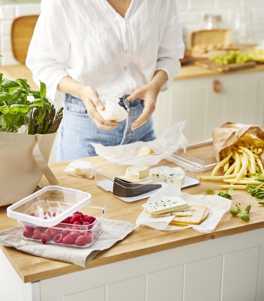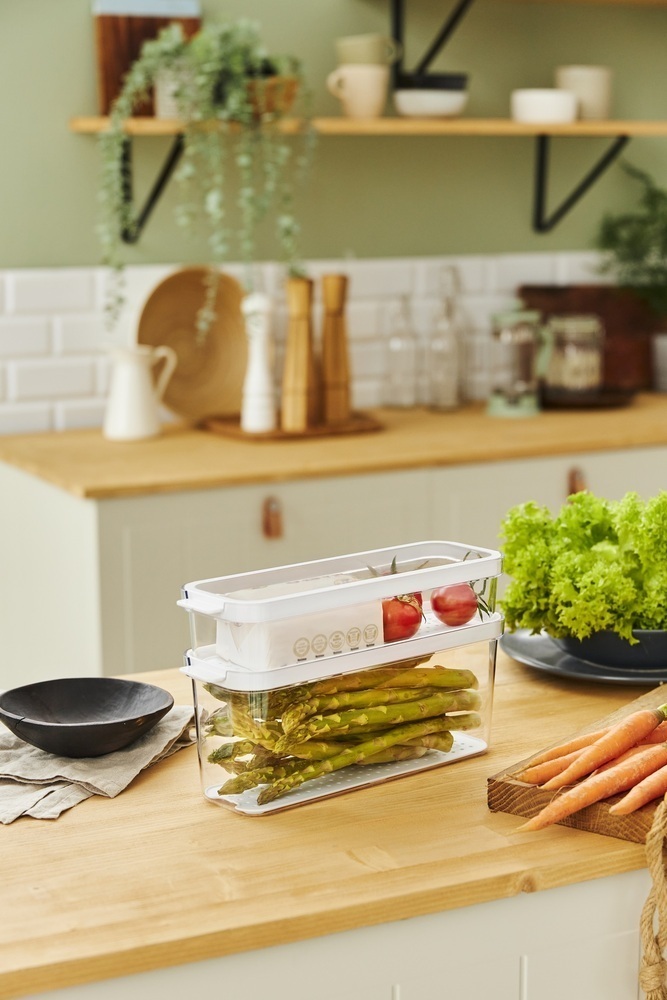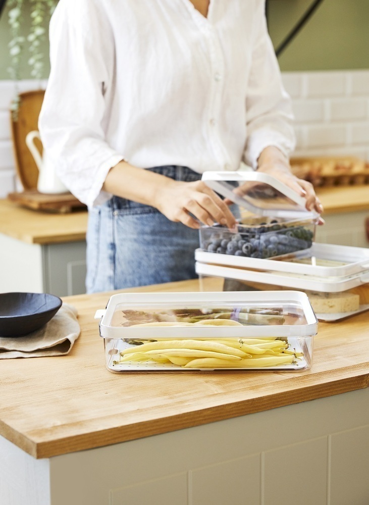 S kompaktnimi dimenzijami 28.2×18.4×3 cm ta škatla ponuja dovolj prostora za različna živila, hkrati pa se prilega v večino hladilnikov.