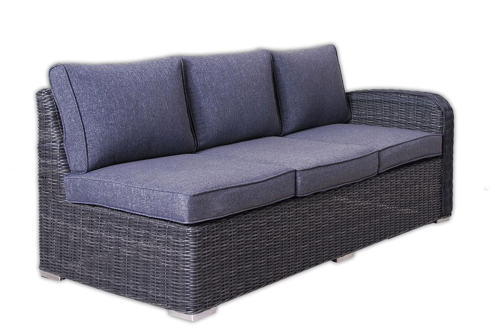 Luksuzna garnitura iz umetnega ratana in aluminijastega ogrodja, namenjena notranjim in zunanjim prostorom. Set vključuje desni kavč (185 cm), levi kavč (207 cm), mizico s kaljenim steklom (140 × 80 cm) in tri omarice. Umetni ratan je trpežen, se ne lušči in ohrani barvo pri temperaturah od +50 °C do -10 °C. Odstranljive blazine s čelno zadrgo omogočajo enostavno pranje in vzdrževanje.