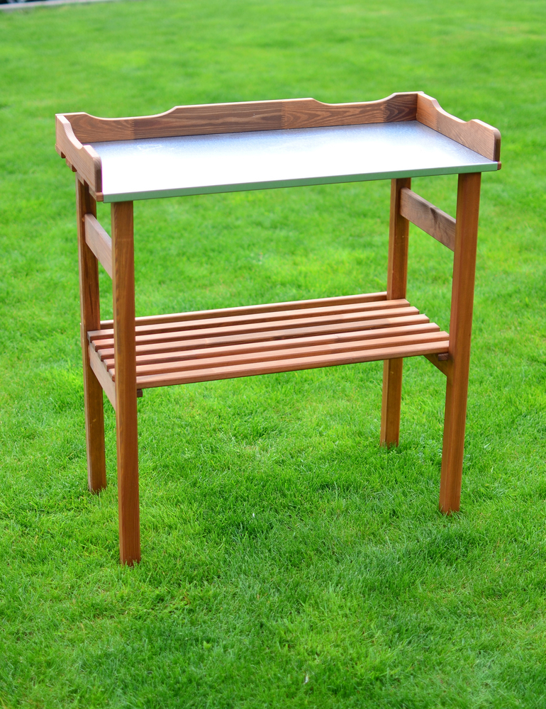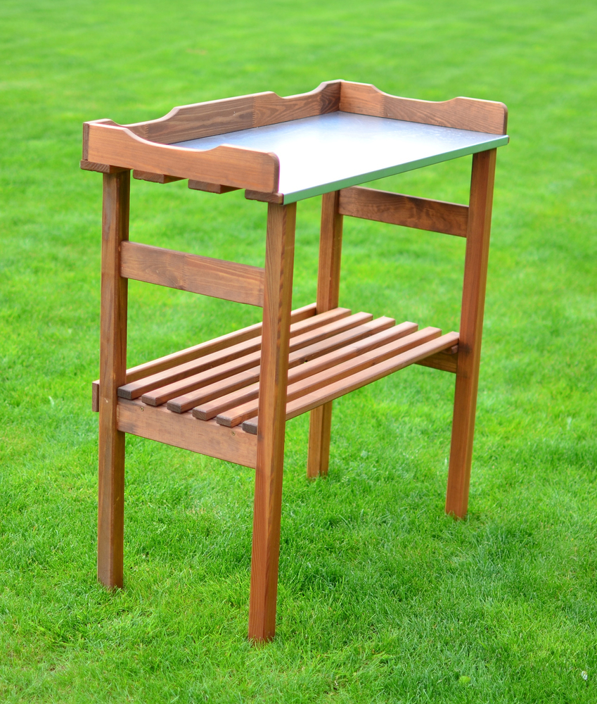 Vrtna mizica za sajenje iz borovega lesa je popolna kombinacija estetike in funkcionalnosti. Izdelana je iz naravnega lesa, s kovinsko ploščo, ki zagotavlja enostavno čiščenje. Poleg tega marinirana barva mizice elegantno dopolnjuje vsak vrtni prostor.