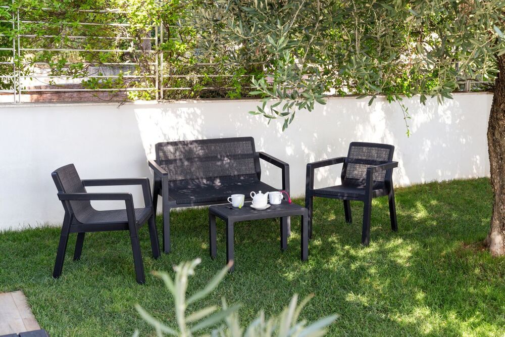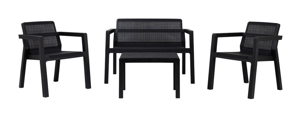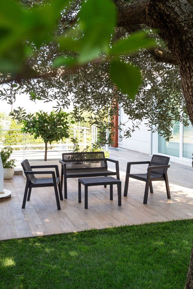 Oblikovana plastika v dizajnu, ki ga je navdihnjena pletena juta, prinese videz premišljane elegance v vaš zunanji prostor. Grafit barva se harmonično ujema s sodobno in klasično arhitekturo, zato set deluje kot naravna razširitev vašega doma.