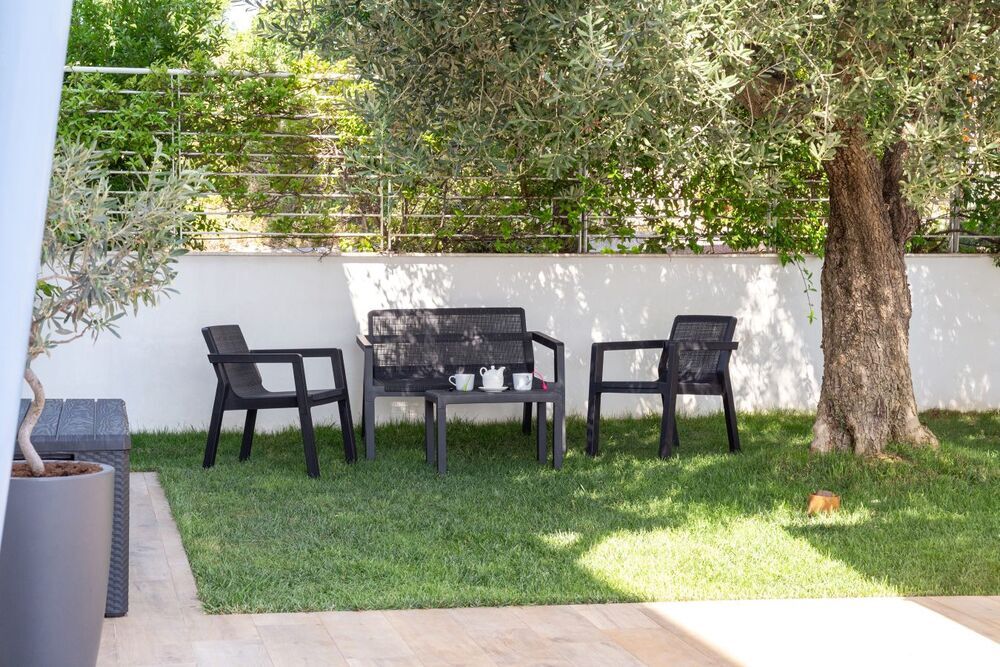Vrtni set RIVIERA je elegantna garnitura iz oblikovane plastike, namenjena štirim osebam. Zasnovan v grafitni barvi s pletenim detajlom, se harmonično ujema s sodobno in klasično arhitekturo. Set je zaščiten pred UV-žarki, kar zagotavlja trajno lepo videz skozi vse letne čase brez posebne nege. Enostavna namestitev ne zahteva orodja, skupna teža pa znaša 23,5 kg.