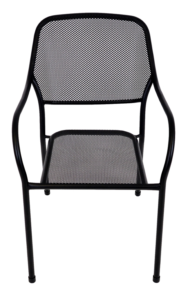 En kovinski vrtni stol črne barve s preprostim, funkcionalnim dizajnom in visoko nosivostjo. Stol je stackable za enostavljejšo shranjevanje.