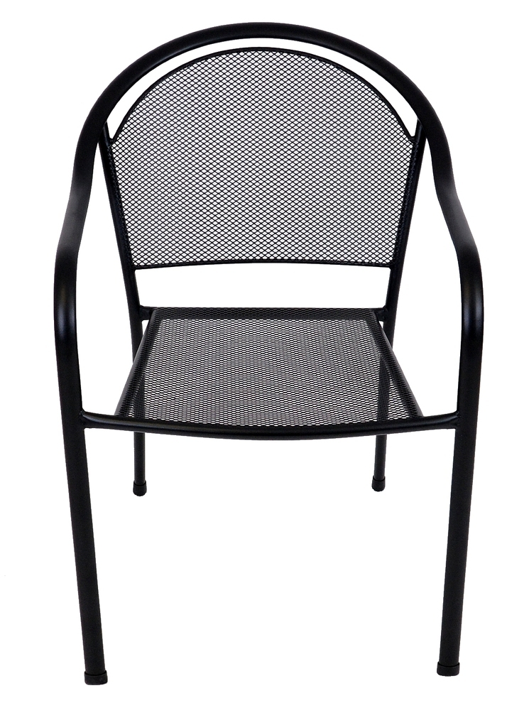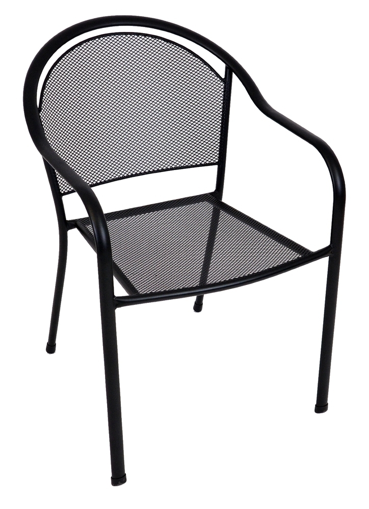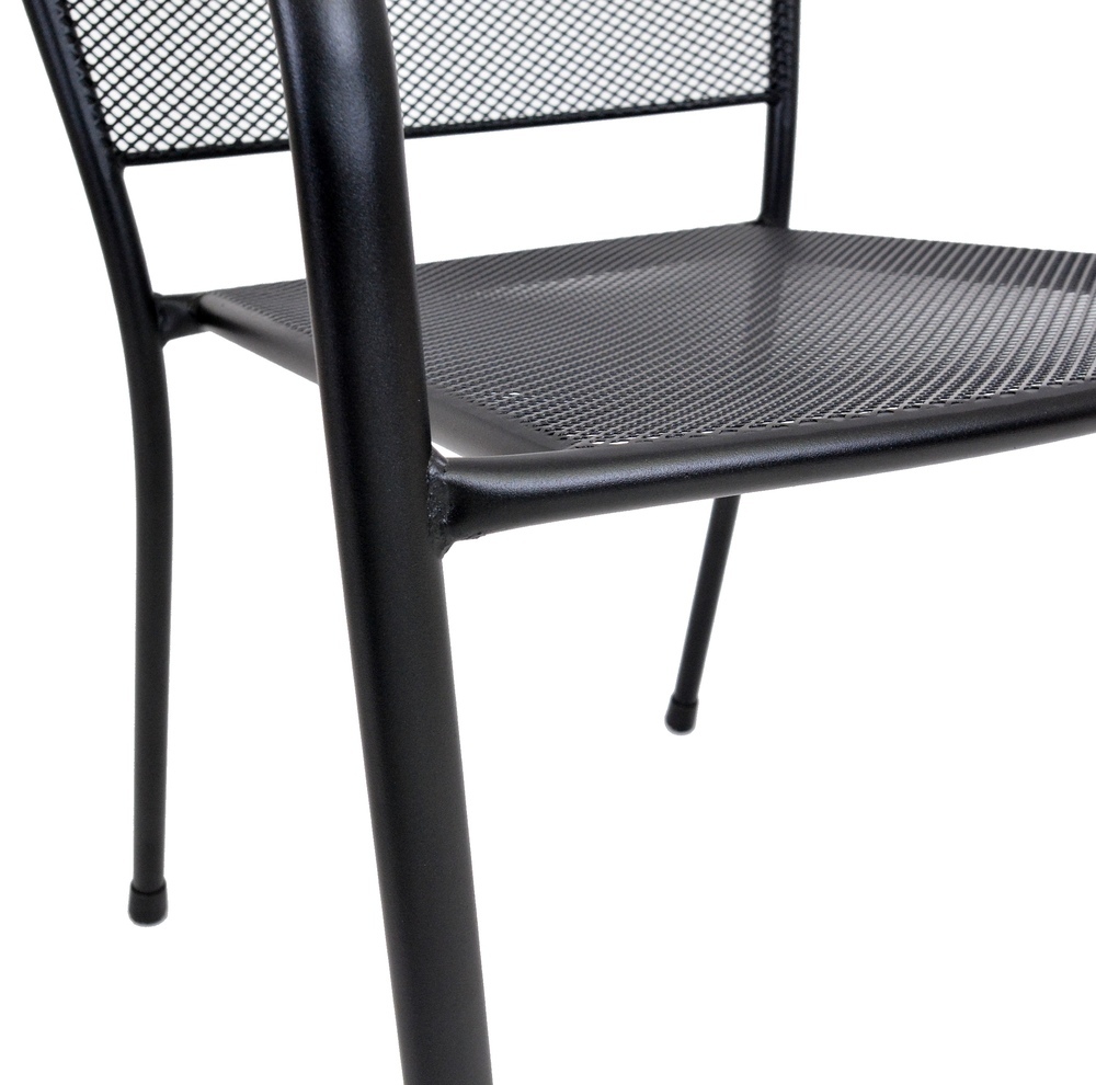 En kovinski vrtni stol ZWMC-260B v črni barvi, pripravljen za uporabo. Stol je izdelan iz kovine taho, posebne kovinske rešetke, kjer je pločevina med proizvodnjo razrezana in raztegnjena v značilno obliko. Ta material zagotavlja trpežnost in praktičnost za dolgoročno uporabo v zunanjem okolju.